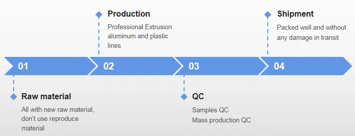 Bilang isang profile ng LED aluminyo at LED plastic profile na propesyonal na tagagawa, ang JE ay palaging nakatuon sa kwalipikasyon ng produkto mula sa aluminyo at plastik na hilaw na materyal hanggang sa linya ng paggawa ng extrusion, mula sa mga sample na kontrol ng kalidad hanggang sa kontrol ng mass, mula sa malakas na perpektong pakete hanggang sa buong serbisyo ng puso.